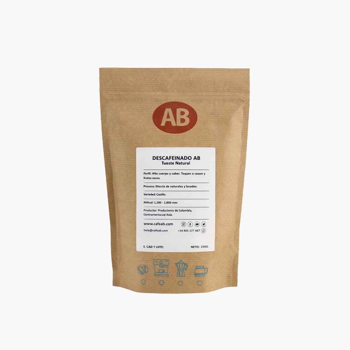 Descafeinado AB 100% Natural. Blend compuesto de cafés descafeinados procedentes de los mejores orígenes que aportan un sabor suave y sutil.